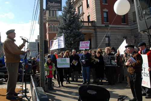 banners, bagpipes, and all, to the Rosary Garden adjoining the Cathedral. There we joined pro-life leaders, current students at the University of Scranton, alumni, and over a hundred faithful Catholics. After addresses by rally organizer Mr. James Burke, Mr. John Ritchie of TFP and several local clergy, the assembled group joined together in a prayerful recitation of the rosary, for an end to the scourge of abortion.