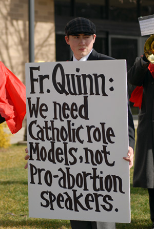 After a blessing and a resounding send-off by the TFP band, the rally dispersed. For us, however, the day was not yet complete. Measured by a steady drum beat, we marched from the cathedral to Brennan Hall, where the pro-abortion speakers were being given a forum. Forming up outside on the green, we held signs: "What would St. Ignatius Say?" and "Fr. Quinn: We need Catholic role models, not pro-abortion speakers" and "Thank you Bishop Bambera."
